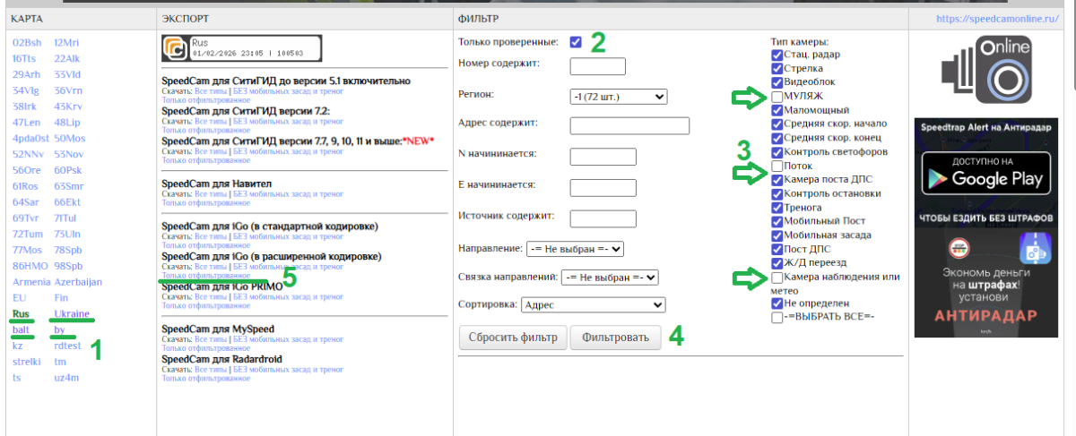 simple_mark2 Опубликовано 2 февраля Поделиться Опубликовано 2 февраля 1. Выбираем страну 2. Ставим птичку "только проверенные" 3. Снимаем галки "муляж", "поток", "камера наблюдения" 4. Нажимаем кнопку "Фильтровать" 5. Ссылка на загрузку "IGO расширенный формат" (и вот тут скачка начинается и обрывается) Файл загружается. Уже потом я все 4 файла конвертирую своей программой в формат карт для Пежо/Ситроен Если есть другие ресурсы для скачивания файлов в расширенном формате IGO, готов рассмотреть. MOV21 и Бес 1 1 Ссылка на комментарий